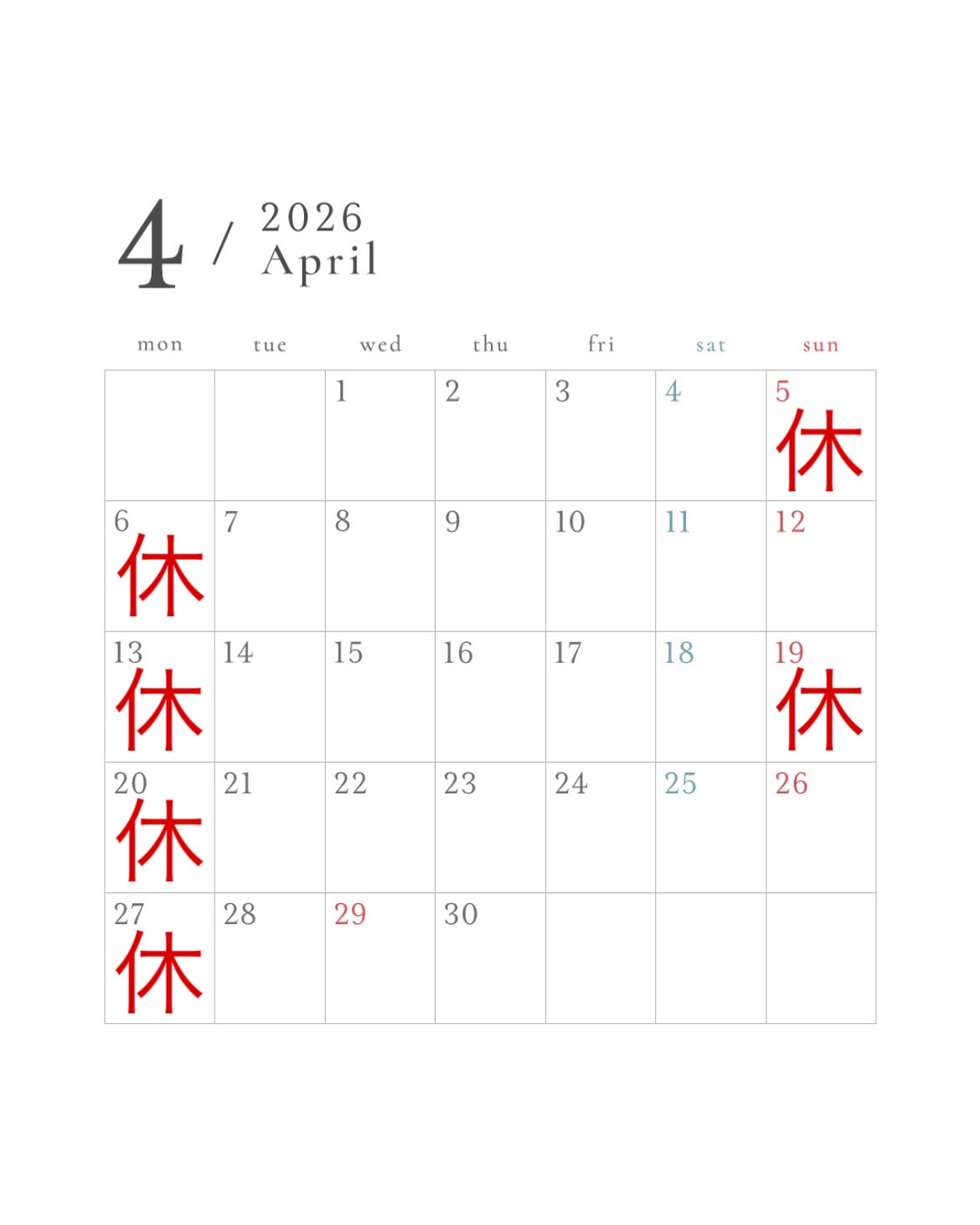 2026年4月のお休み 2026.03.05Uncategorized ※4/8(火)ご希望の方は、お手数ですがお電話ください。 UncategorizedHair Salon siro, N., type:, Xトリートメント, カット, カラー, ショートカット, トリートメント, ヘアサロンシロ, ミルボン, 大泉siro 2026年3月のお休み